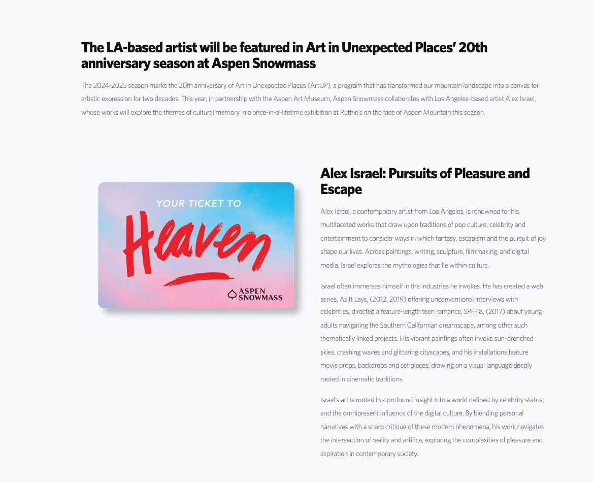 Alex Israel – For ArtUP’s 20th anniversary in 2024–2025, I supported the collaboration with Alex Israel, bringing his “Heaven” exhibition to the historic Ruthie’s building on Aspen Mountain, documenting the project, and creating storytelling to celebrate the milestone season.